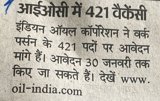 इंडियन ऑयल कॉर्पोरेशन ने वर्क पर्सन के 421 पदों पर आवेदन मांगे हैं। आवेदन 30 जनवरी तक किए जा सकते हैं। देखें www. oil-india.com