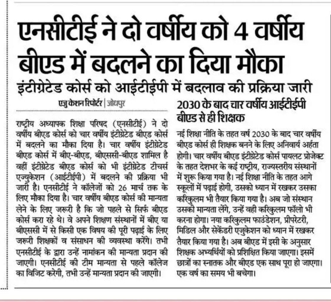 इंटीग्रेटेड कोर्स को आईटीईपी में बदलाव की प्रक्रिया जारीएजुकेशन रिपोर्टर | जोधपुरराष्ट्रीय अध्यापक शिक्षा परिषद (एनसीटीई) ने दोवर्षीय बीएड कोर्स को चार वर्षीय इंटीग्रेटेड बीएड कोर्समें बदलने का मौका दिया है। चार वर्षीय इंटीग्रेटेडबीएड कोर्स में बीए-बीएड, बीएससी बीएड शामिल हैवहीं इंटीग्रेटेड बीएड कोर्स को भी इंटीग्रेटेड टीचर्सएज्युकेशन (आईटीईपी) में बदलने की प्रक्रिया भीजारी है। एनसीटीई ने कॉलेजों को 26 मार्च तक केलिए मौका दिया है। चार वर्षीय बीएड कोर्स की मान्यतालेने के लिए जरूरी है कि जो पहले से सिर्फ बीएडकोर्स करा रहे थे। वे अपने शिक्षण संस्थानों में बीए याबीएससी में से किसी एक विषय की पूरी पढ़ाई के लिएजरूरी शिक्षकों व संसाधन की व्यवस्था करेंगे। तभीएनसीटीई के द्वारा उन्हें नामांकन की मान्यता प्रदान कीजाएगी। एनसीटीई की टीम मान्यता से पहले कॉलेजका विजिट करेगी, तभी उन्हें मान्यता प्रदान की जाएगी।2030 के बाद चार वर्षीय आईटीईपीबीएड से ही शिक्षकनई शिक्षा नीति के तहत वर्ष 2030 के बाद चार वर्षीयबीएड कोर्स ही शिक्षक बनने के लिए अनिवार्य अर्हताहोगी। चार वर्षीय बीएड इंटीग्रेटेड कोर्स पायलट प्रोजेक्टके तहत देशभर के कई राष्ट्रीय, राज्यस्तरीय संस्थानोंमें शुरू किया गया है। नई शिक्षा नीति के तहत आगेस्कूलों में पढ़ाई होगी, उसको ध्यान में रखकर उसकाकरिकुलम भी तैयार किया गया है। अब जो संस्थानउसकी मान्यता लेंगे, उन्हें वही करिकुलम फॉलो भीकरना होगा। नया करिकुलम फाउंडेशन, प्रीपरेटरी,मिडिल और सेकेंडरी एजुकेशन को ध्यान में रखकरतैयार किया गया है। अब बीएड में इसी के अनुसारशिक्षक अभ्यर्थियों को प्रशिक्षित किया जाएगा। इसमेंछात्रों का स्नातक और बीएड एक साथ पूरा हो जाएगा।एक वर्ष का समय भी बचेगा।
