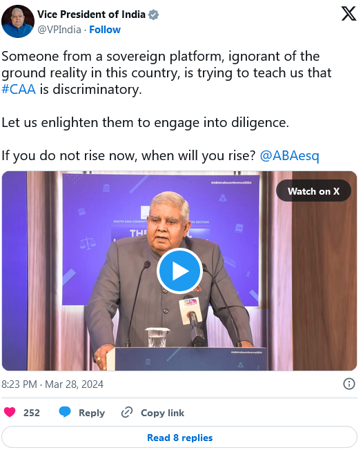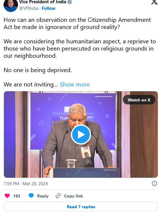 सीएए के तहत नागरिकता के लिए 2014 की कट ऑफ डेट का जिक्र करते हुए उपराष्ट्रपति ने कहा कि हम इसका लाभ लेने के लिए लोगों को आमंत्रित नहीं कर रहे हैं. उन्होंने जोर देकर कहा, “इसका लाभ किसे दिया जा रहा है? जो पहले से ही इस देश में हैं। वे एक दशक से अधिक समय से इस देश में हैं।”