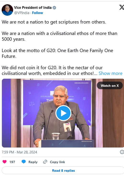 वीपी ने आगे कहा कि ‘कुछ देश ऐसे हैं, जो कई मंचों से हमें सिखाना चाहते हैं कि लोकतंत्र क्या है?’ और युवाओं से सोशल मीडिया और अन्य प्लेटफार्मों पर ऐसी चीजों के खिलाफ बोलने के लिए कहा। उन्होंने युवा दिमागों से देशों को प्रबुद्ध करने, हमें उनकी अज्ञानता से सबक सिखाने की कोशिश करने, परिश्रम में संलग्न होने का आह्वान किया।