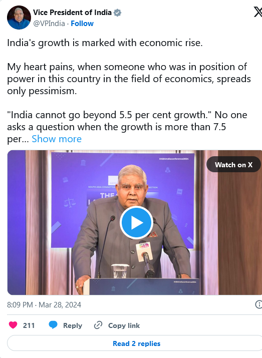 भारत की नाजुक पांच से बड़ी पांच तक की आर्थिक यात्रा का पता लगाते हुए, उपराष्ट्रपति ने उन लोगों से सवाल किया जो सत्ता में थे लेकिन केवल निराशावाद फैलाते थे। उन्होंने कहा, “मेरा दिल दुखता है, जब इस देश में सत्ता की स्थिति में रहने वाला कोई व्यक्ति अर्थशास्त्र के क्षेत्र में केवल निराशावाद फैलाता है।”