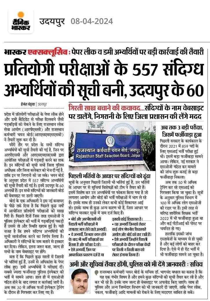 गिरती साख बचाने की कवायद….संदिग्धों के नाम वेबसाइटप्रदेश में प्रतियोगी परीक्षाओं के पेपर लीक होनेसेने पर डालेंगे, निगरानी के लिए जिला प्रशासन की लेंगे मगड़बड़ियों को रोकने के लिए राजस्थान लोकसेवा आयोग (आरपीएससी) और राजस्थानकर्मचारी चयन बोर्ड (आरएसएमएसएसबी)ने तैयारी शुरू कर दी है।फौरी तौर पर प्रदेश के सभी संदिग्धअभ्यर्थियों की सूची तैयारी की गई है, जिन परआरपीएससी और आरएसएमएसएसबी द्वाराआयोजित परीक्षाओं में गड़बड़ी करने का शकहै। इन संदिग्धों की सूची सभी जिला पुलिसअधीक्षक और जिला कलेक्टर को भेज दी गई है,ताकि इन पर निगरानी की जा सके। चयन बोर्डके अनुसार प्रदेश में 557 संदिग्ध अभ्यर्थियोंकी सूची तैयारी की गई है। इनमें उदयपुर के 60अभ्यर्थी हैं। इन सभी संदिग्धों की जानकारी बोर्डकी वेबसाइट पर डाली जाएगी।बोर्ड के एक अधिकारी ने इस नई कवायदके पीछे तर्क दिया है कि पिछले कुछ वर्षोंमें आयोजित प्रतियोगी परीक्षाओं की साखगिरी है। पिछले दिनों जिस तरह एसओजीपुलिस इंस्पेक्टर की भर्ती में गड़बड़ियां पकड़ीहैं उससे तो और स्थिति खराब हुई है। यहीवजह है कि हमने संदिग्ध अभ्यर्थियों कीसूची सार्वजनिक करने का निर्णय लिया है।अधिकारी ने संदिग्धों के नाम बताने से इनकारकर दिया। लेकिन इतना जरूर कहा, जल्द हीसभी के नाम वेबसाइट पर होंगे।बता दें कि पिछले कुछ सालों में जितनीराजस्थान कर्मचारी चयन बोर्ड, जयपुरRajasthan Staff Selection Board, Jaipurपिछली भर्तियों के आधार पर संदिग्धों को ढूंढासूत्रों के अनुसार पिछली जितनी भी भर्तियां हुई हैं, उन भर्तियोंके आधार पर से सूचियां विशेषज्ञों की टीम ने तैयार की हैं।इसमें विशेष कर उन अभ्यर्थियों पर फोकस किया गया है जोलगातार आयोग और बोर्ड की भर्ती परीक्षाओं में भाग ले रहेहैं। इसके साथ ही उनको लेकर कभी कोई शिकायत आईहो। इसके साथ ही कुछ अन्य कारण भी हैं, जिस आधार परसंदिग्ध मानकर सूची में नाम दर्ज किए हैं।★ बोर्ड और आरपीएससी कीपिछली भर्ती परीक्षाओं मेंलगातार भाग लेने वाले अभ्यर्थी ।वे अभ्यर्थी, जिनका चयन होनेके बाद भी भर्ती परीक्षाओं काहिस्सा हैं और परीक्षा दे रहे।• ऐसे अभ्यर्थी, जिन परआपराधिक प्रकरण दर्ज है याइसकी कोई शिकायत है।• वह अभ्यर्थी जिनको लेकरकई लोग गोपनीय शिकायतेआयोग और बोर्ड को कर रखी हैं।• ऐसे अभ्यर्थी जिन्होंने पिछलीपरीक्षाओं के दौरान परीक्षा केंद्रोंपर किसी न किसी बात कोलेकर हंगामा किया है।अब तक 3 बड़ी परीक्षा,जिसमें फर्जीवाड़ा हुआपिछली सरकार के कार्यकाल केदौरान 2021 में 859 पदों केलिए एसआई भर्ती परीक्षा हुईथी। इसमें बड़ा फर्जीवाड़ा सामनेआया लेकिन नई सरकार नेएसओजी गठित कर मामलेकी जांच शुरू कराई तो बड़ाफर्जीवाड़ा निकला।अब तक 50 से अधिकट्रेनिंग कर रहे एसआ