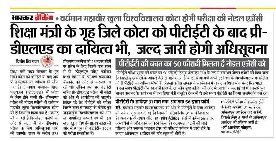 शिक्षा मंत्री मदन दिलावर के गृहजिले कोटा को पीटीईटी के बाद अबप्री-डीएलएड का दायित्व भी सौंपागया है। दो वर्षीय अध्यापक शिक्षापाठ्यक्रम (डीएलएड) मैं प्रवेशके लिए होने वाली प्री- डीएलएडपरीक्षा की नोडल एजेंसी भी वर्धमानमहावीर खुला विश्वविद्यालय कोटाको ही निर्धारित किया गया है। उम्मीदकी जा रही है कि नोडल एजेंसी कीओर से जल्द ही प्री- डीएलएडपरीक्षा के लिए अधिसूचना जारीकी जाएगी। राज्य के करीब 375डीएलएड कॉलेज की 25 हजार सीटों पीटीईटी की बचत का 50 फीसदी मिलता है नोडल एजेंसी कोपर प्रवेश के लिए पिछले पांच सालसे प्री- डीएलएड परीक्षा पंजीयनशिक्षा विभाग के परीक्षण राजस्थानबीकानेर की ओर से करवाई जारही थी। लेकिन इस बार पीटीईटीसहित प्री-डीएलएड परीक्षा भी कोटाकी ओर से आयोजित की जाएगी।विदित रहे कि पीटीईटी की परीक्षापिछले साल बांसवाड़ा के गोविंद गुरुजनजातीय विश्वविद्यालय की ओरसे आयोजित करवाई गई थी। इससाल खुला विश्वविद्यालय कोटा कीओर से 9 जून को पीटीईटी- 2024की परीक्षा प्रस्तावित है।पीटीईटी परीक्षा में शामिल होनेपीटीईटी परीक्षा शुल्क की बचत का 50 फीसदी हिस्सा प्रोत्साहन राशि के रूप में संबंधित नोडल एजेंसी को दिया जाताहै। पिछले कुछ सालों के आंकड़े देखे तो यही कारण है कि हर शिक्षा मंत्री अपने गृह जिले के विश्वविद्यालय या कॉलेजको ही पीटीईटी का दायित्व सौंपते हैं। पिछली कांग्रेस सरकार के कार्यकाल में जब उच्च शिक्षा मंत्री भंवर सिंह भाटीथे उसे समय पीटीईटी तीन साल बीकानेर के राजकीय डूंगर कॉलेज की ओर से आयोजित करवाई गई थी। उससे पूर्वभाजपा सरकार के कार्यकाल में जब शिक्षा मंत्री वासुदेव देवनानी थे उसे समय पीटीईटी का जिम्मा अजमेर के पास रहा।पीटीईटी के आवेदन 31 मार्च तक, अब तक 56 हजार फॉर्मभरेः वर्धमान महावीर विश्वविद्यालय की ओर से पीटीईटी के लिए आवेदनकी प्रक्रिया शुरू कर दी गई है। जिसकी अंतिम तिथि 31 मार्च निर्धारितहै। अब तक दो वर्षीय और चार वर्षीय इंटीग्रेटेड कोर्स में करीब 56 हजारअभ्यर्थियों ने ऑनलाइन आवेदन किया है। दरअसल, 12वीं की बोर्डपरीक्षाएं और स्नातक फाइनल ईयर की परीक्षाएं वर्तमान में जारी होने केकारण ऑनलाइन आवेदन की गति बहुत ही धीमी है।के लिए अभ्यर्थी 31 मार्च तकऑनलाइन आवेदन कर सकेंगे।जिसके लिए 6 मार्च से ऑनलाइनआवेदन की प्रक्रिया जारी है।-डॉ. आलोक चौहान,समन्वयक, पीटीईटी