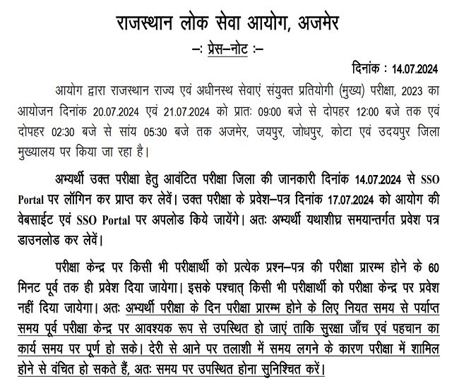 - आरपीएससी आरएएस (मुख्य) परीक्षा के लिए एग्जाम सिटी स्लिप जारी।