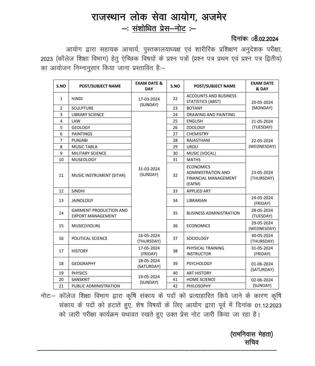 कॉलेज शिक्षा विभाग, राजस्थान Assistant Professor, Librarian, PTI भर्ती-2023 : ऐच्छिक विषयों का संशोधित परीक्षा कार्यक्रम जारी।